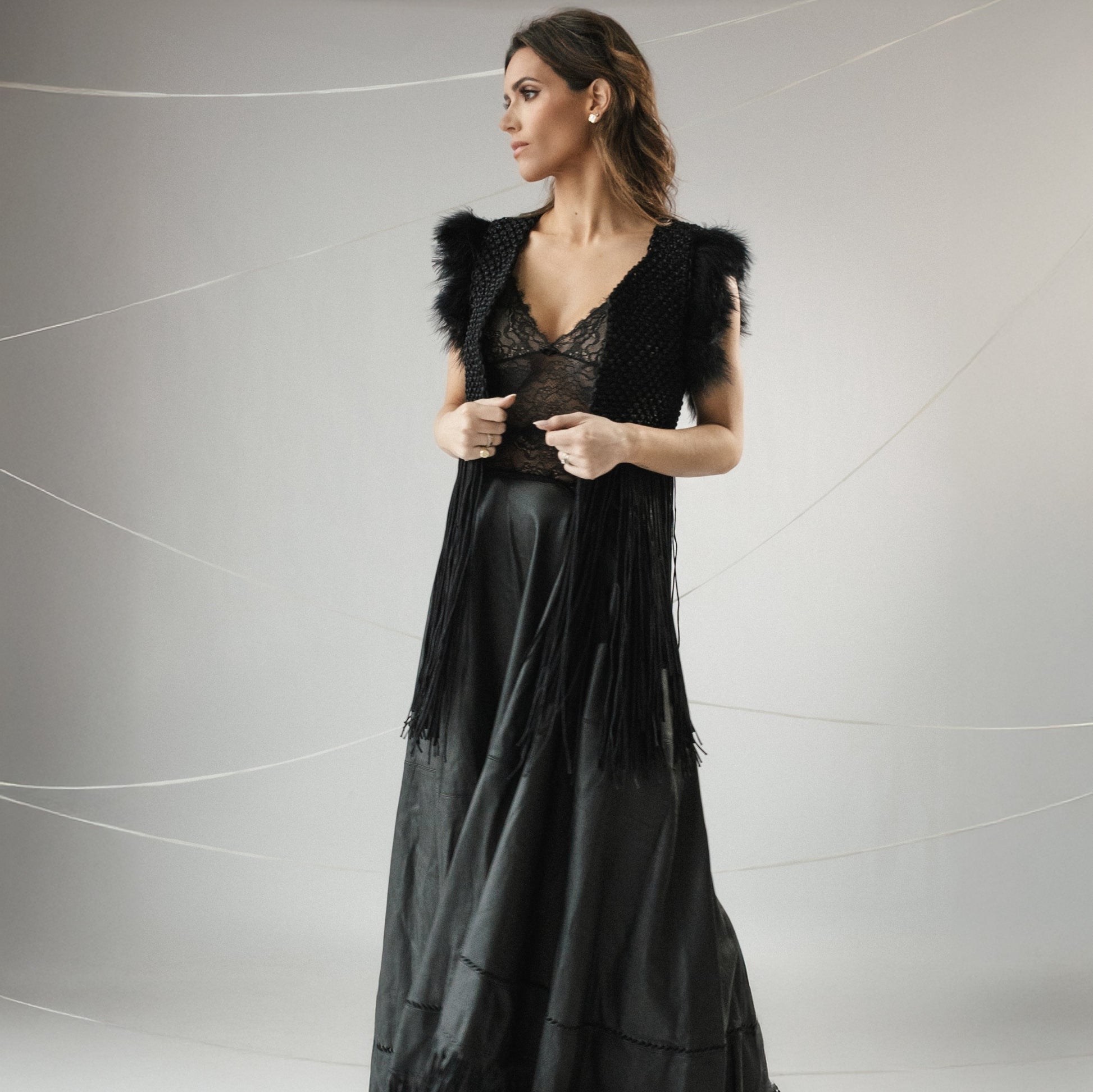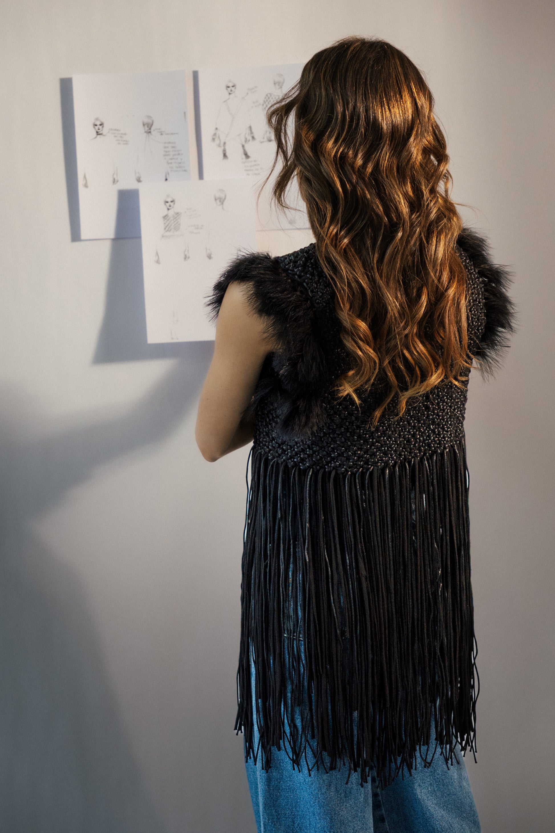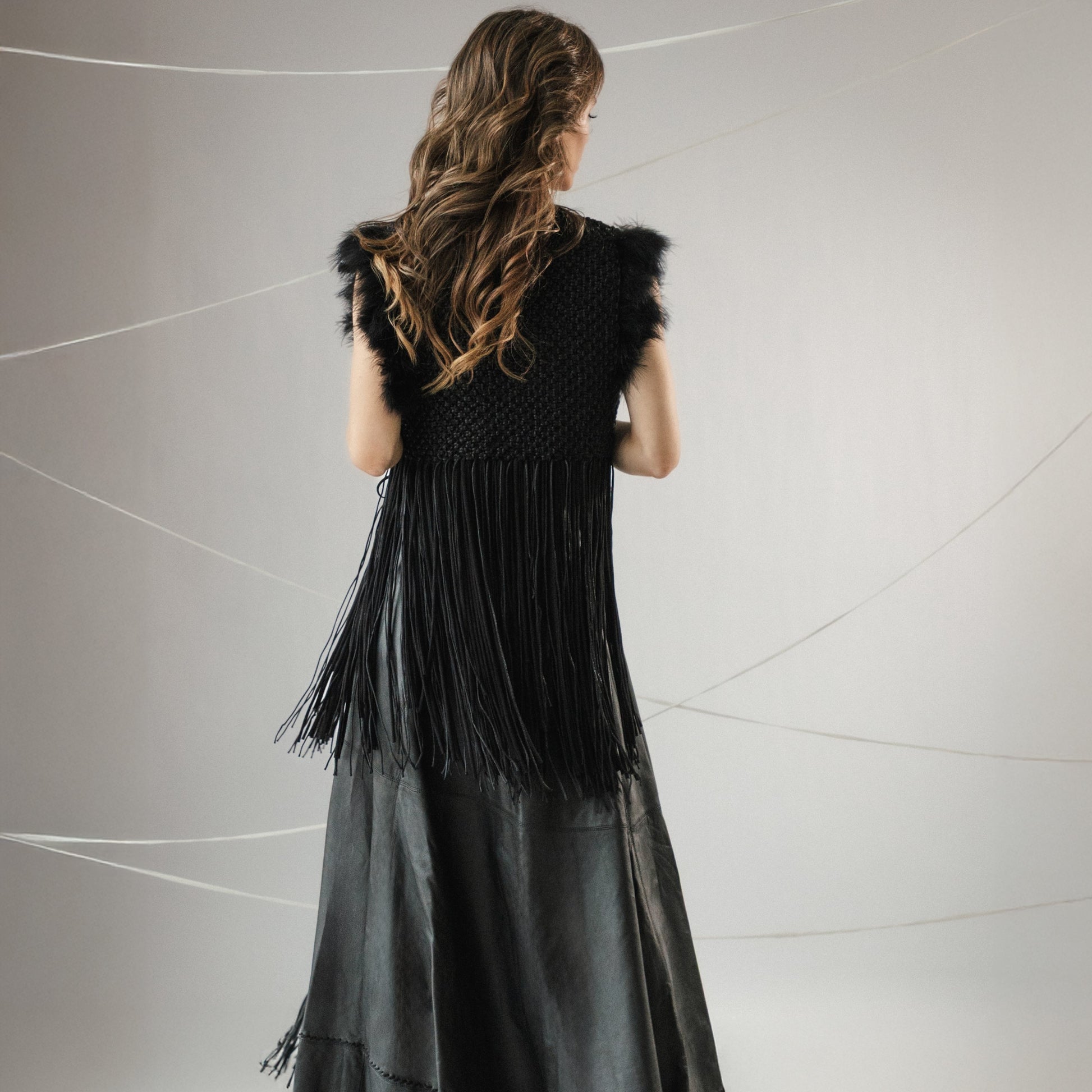 Confeccionado a mano con detalle minucioso, este chaleco resalta por su diseño entramado, combinación de dos materiales como el hilo de seda y trapillo.