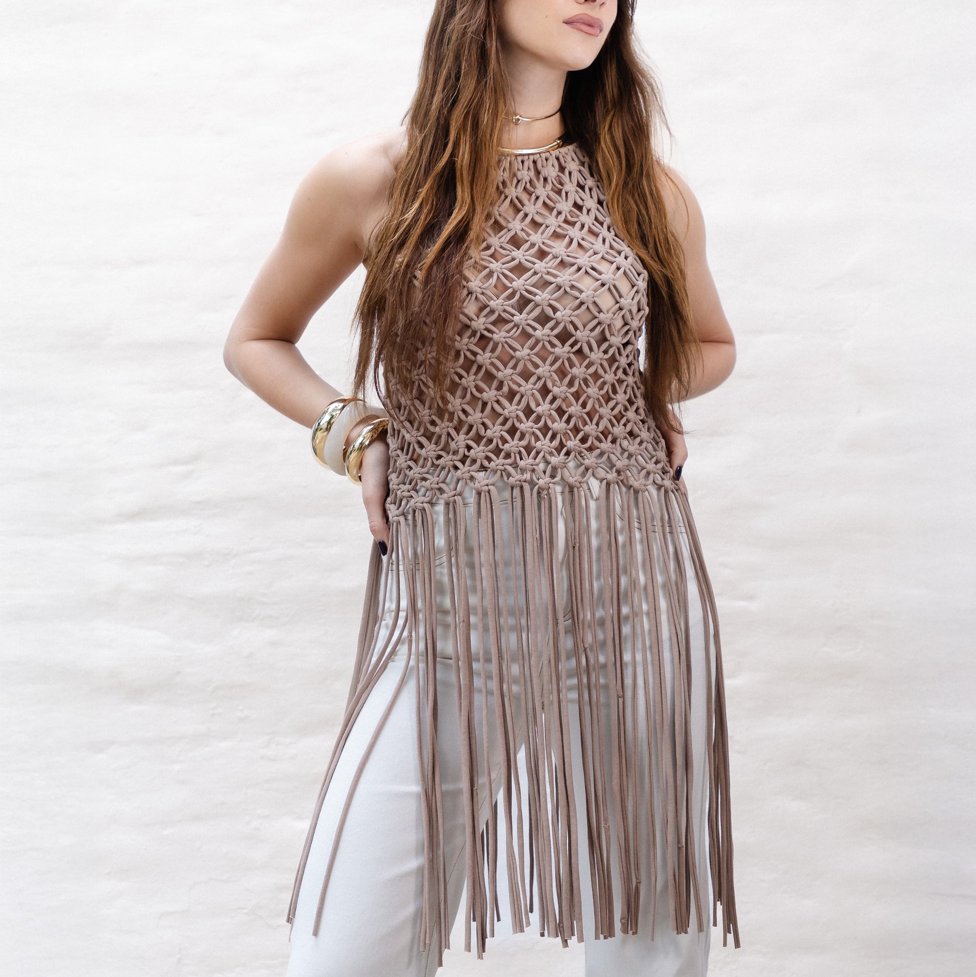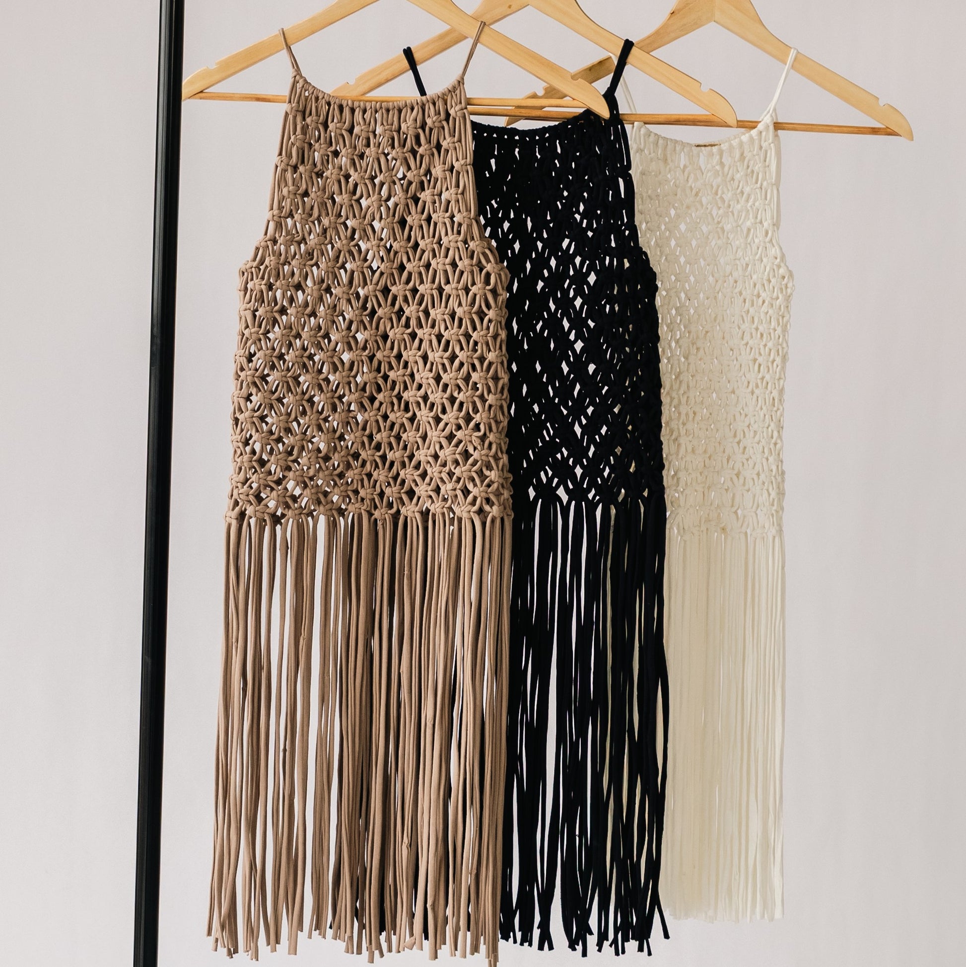 Prenda artesanal elaborada en macramé, confeccionada con trapillo (residuo textil) de alta calidad que aporta textura, resistencia y un acabado distintivo.
