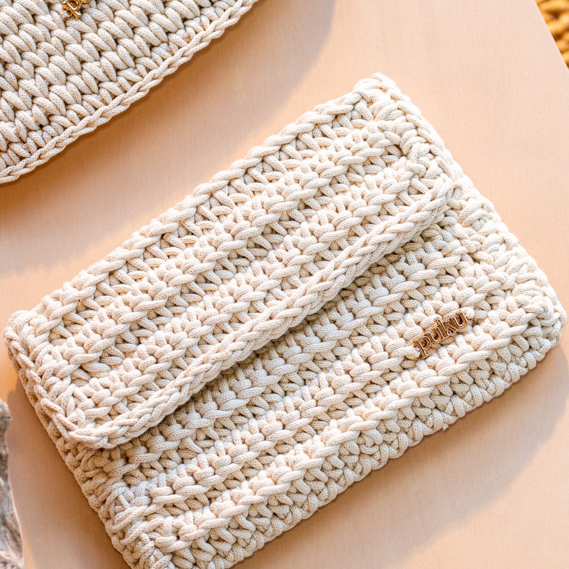 El complemento perfecto de la Cartera Duna. Tejido a crochet en cordón, práctico para llevar maquillaje, protector solar o esenciales del día. Compacto, funcional y con estilo artesanal.